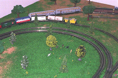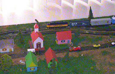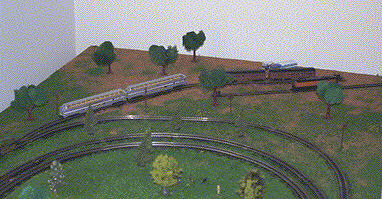 The challenge - build a simple N scale railroad without having the luxury of time to do a picture-perfect job. The goal was to make it sturdy, bright and attractive. I think we did okay, too. The railroad was finished in a couple of two-hour sessions. The methods we used for scenery are those given in our online scenery manuals.