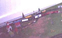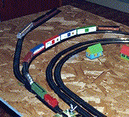 This entire N scale layout takes up only 32" by 60"! It took a couple of hours to do the roadbed, track and wiring, and a couple more to finish the scenery. We used Atlas track and switches, LifeLike operating crossing gates, LifeLike Grass, Earth and ballast, various brands of trees, houses, miniature vehicles and people. The diesels featured here are the Bachmann Chessie F9a (top right) and LifeLike Milwaukee SD7. In the third picture on the right, you might be able to pick out a Model Power Conrail C-420 moving parallel to the Chessie train.