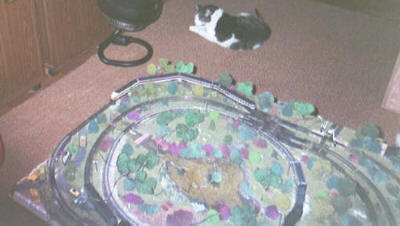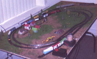 | The next three photos show our own 32" by 40" layout. The background shows just how small this layout is! Our own layout has 3 loops, a lake, and two tiny stations. Look closely - you can see a Lackawanna E8 with the Phoebe Snow passenger liner, an RS3 haulking the local, and a work train on the middle arc. The beauty of N scale is that it can fit almost anyone's living space and it looks beautiful! | ![]() |